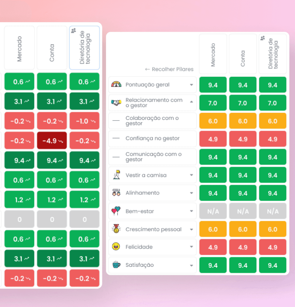 Compare resultados para entender o impacto de cada pilar em setores distintos, permitindo a criação de planos de ação direcionados e eficazes. Acompanhe a evolução de áreas específicas e garanta que toda a empresa esteja alinhada em busca dos mesmos objetivos.
