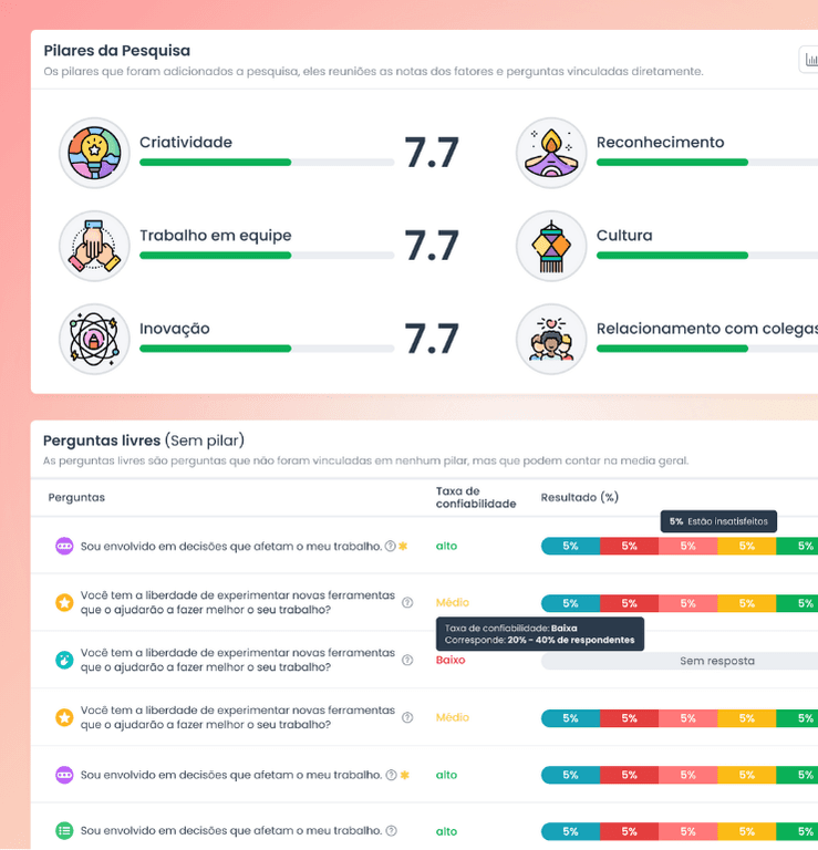 Você tem acesso a informações detalhadas que realmente fazem a diferença. Escolha os pilares e fatores mais relevantes para sua organização e transforme os dados coletados em insights acionáveis, facilitando a tomada de decisões estratégicas.