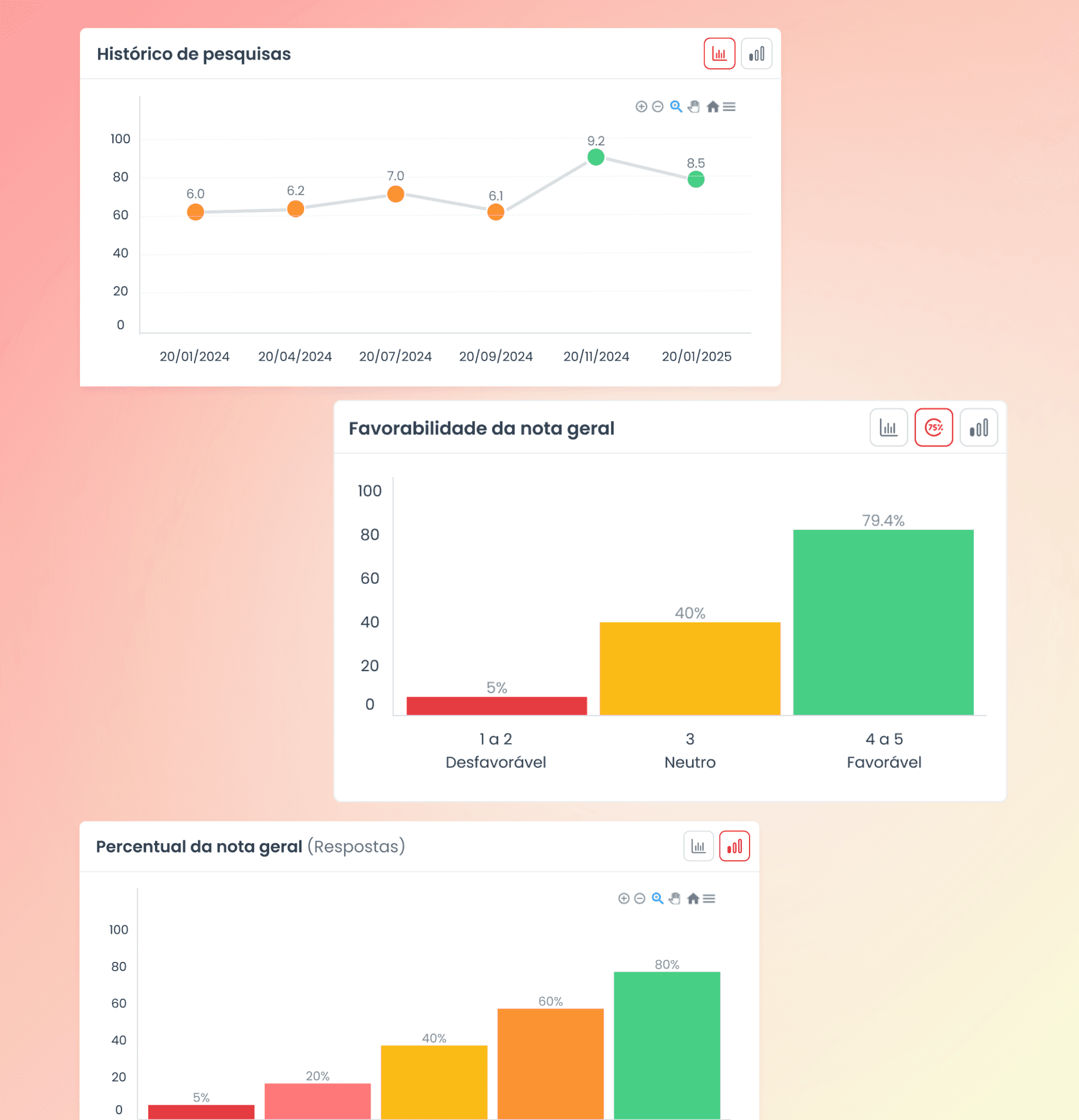 Visualize dados de forma intuitiva e compreenda como a percepção dos colaboradores muda em diferentes períodos ou circunstâncias, com relatórios personalizados para cada necessidade: