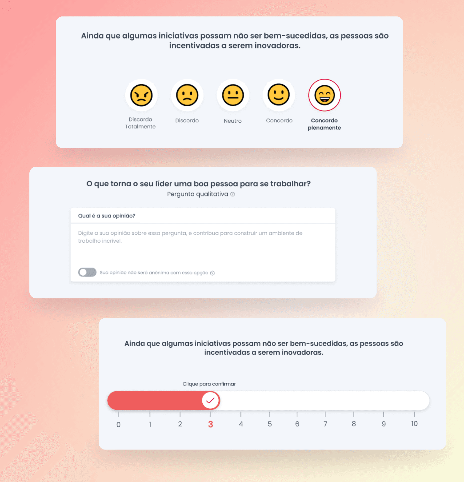 Crie pesquisas que se adaptem à linguagem da sua equipe, tornando o processo intuitivo e prazeroso. A interface lúdica e moderna garante altas taxas de participação, enquanto você mantém total controle sobre o conteúdo e os formatos utilizados.