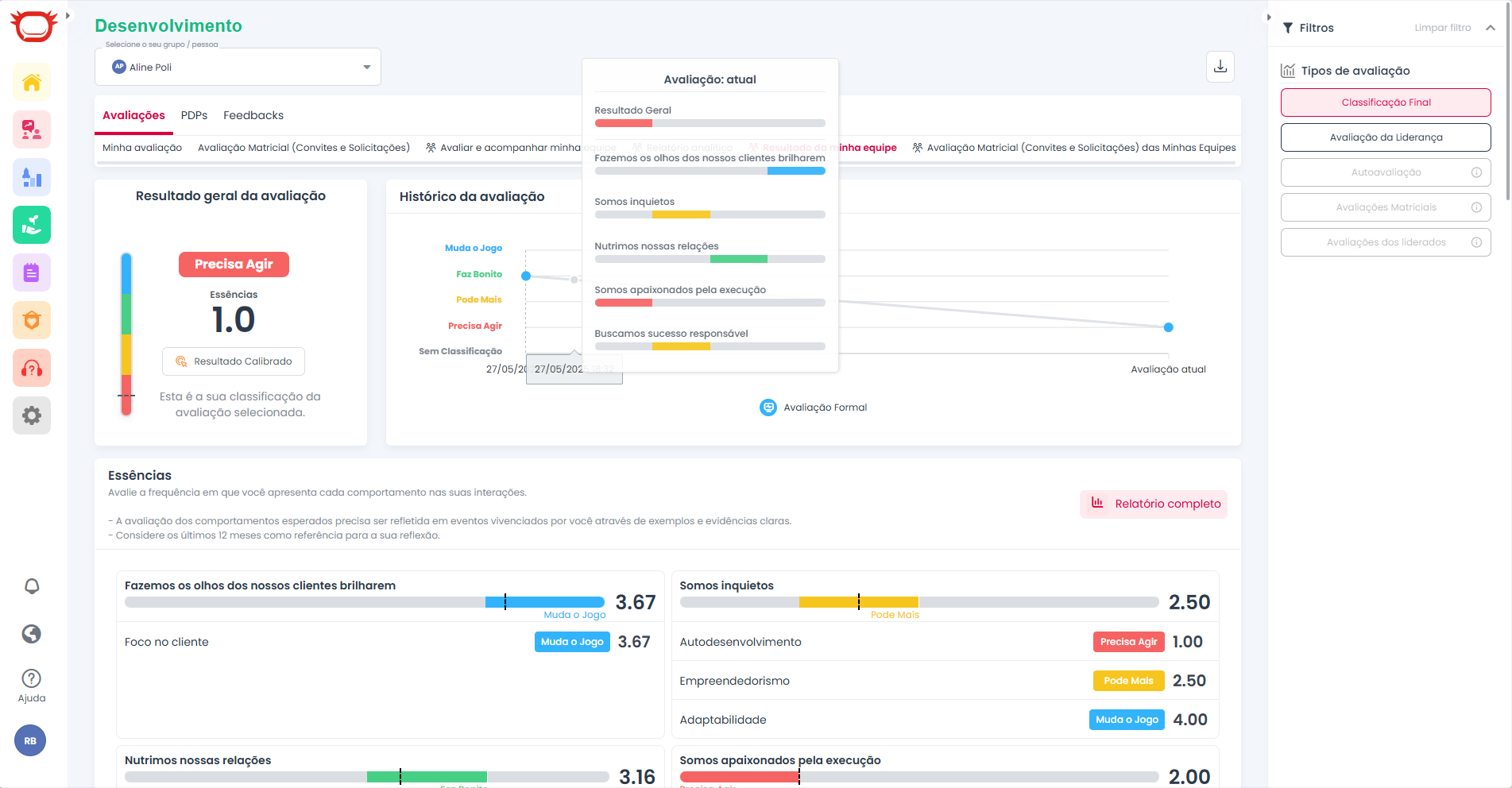 Sim. OKRs e metas do módulo de Performance podem ser vinculados às avaliações. O desempenho e o desenvolvimento se conectam em uma visão integrada.